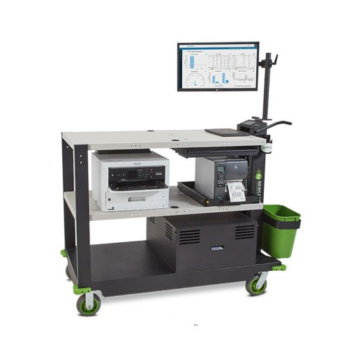 All listed PC Series Mobile Powered Workstations come standard with (one) adjustable height shelf, 6” locking casters, push handles, integrated power system and power strip, waste basket, and holder.